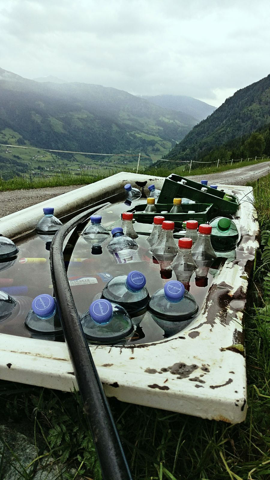 Und da man auf 1460m und ohne Strom, nur einen Erd-Kühlschrank zur Verfügung und der nur begrenzt Kapazitäten fasst, haben wir den „anderen Kühlschrank“ für unsere Getränkekühlung aktiviert. Damit meine ich die alte Badewanne mit Direktzufluss von kaltem, klaren Wasser aus der Bergquelle etwas oberhalb. Die steht zwar etwas unterhalb der Hütte, aber die paar Meter schaden einem ja nicht 😉